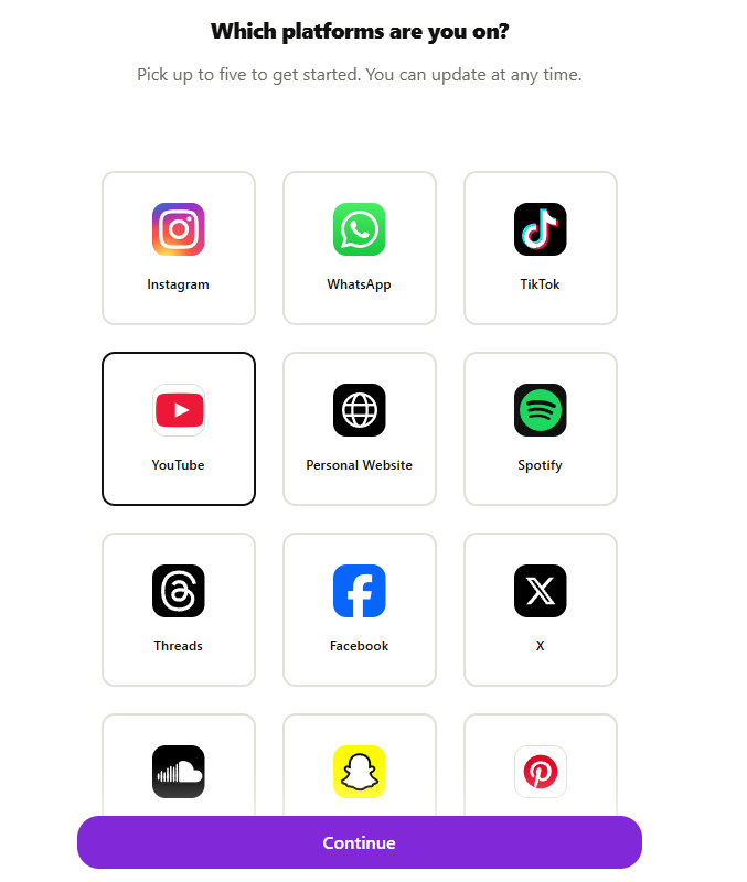 로그인을 완료하면 링크트리를 어떤 플랫폼에서 주로 사용할 것인지 묻는 단계가 나옵니다.