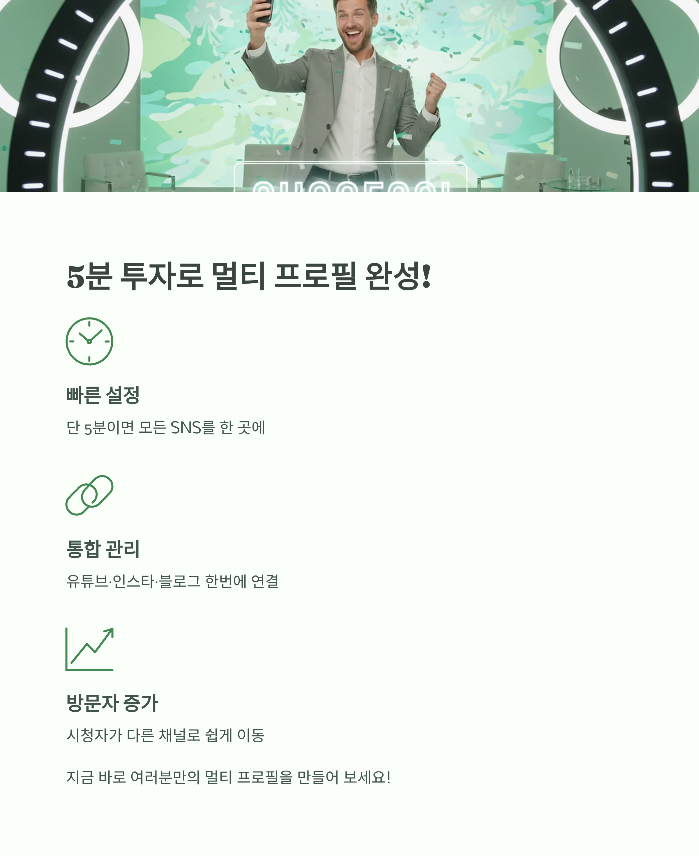 이렇게 만들어둔 링크 모음 하나면, 시청자나 이웃들이 나의 다른 SNS 채널로 쉽고 편하게 찾아올 수 있습니다. 지금 바로 5분만 투자해서 여러분만의 '멀티 프로필'을 완성해 보세요!