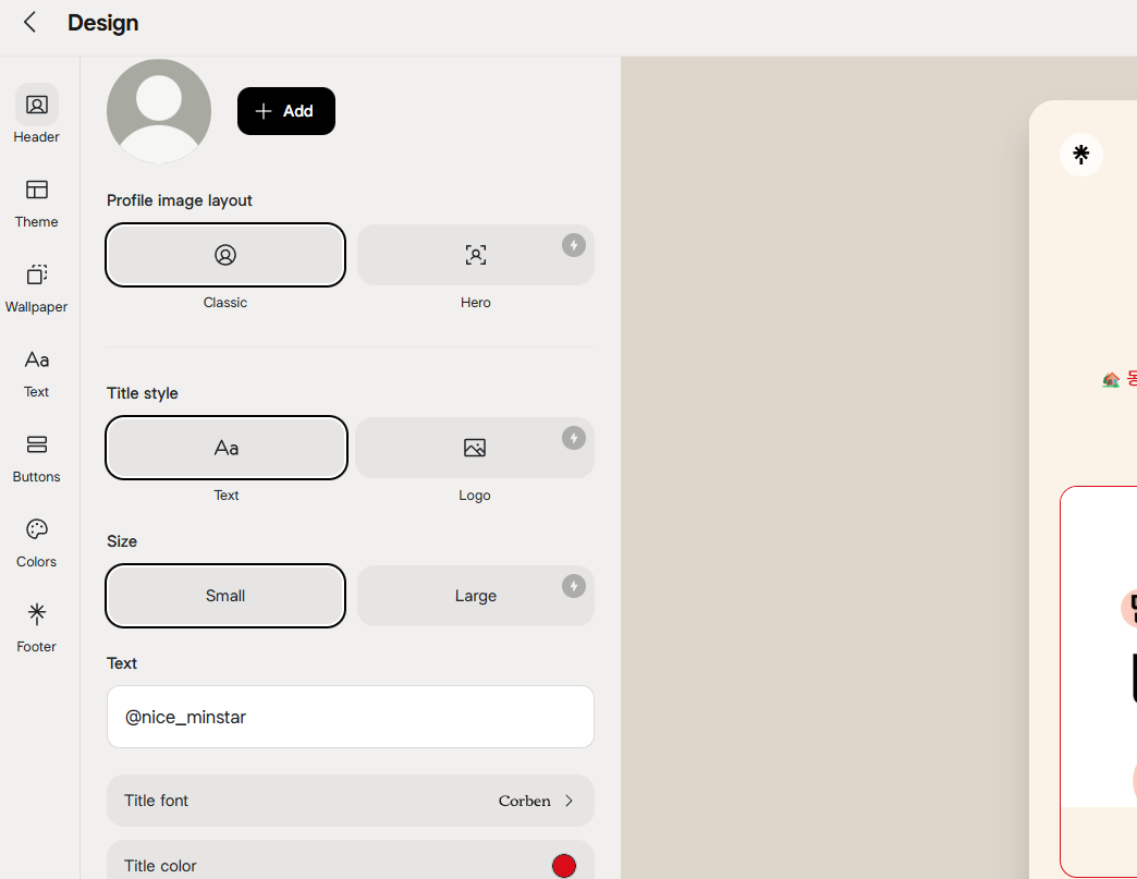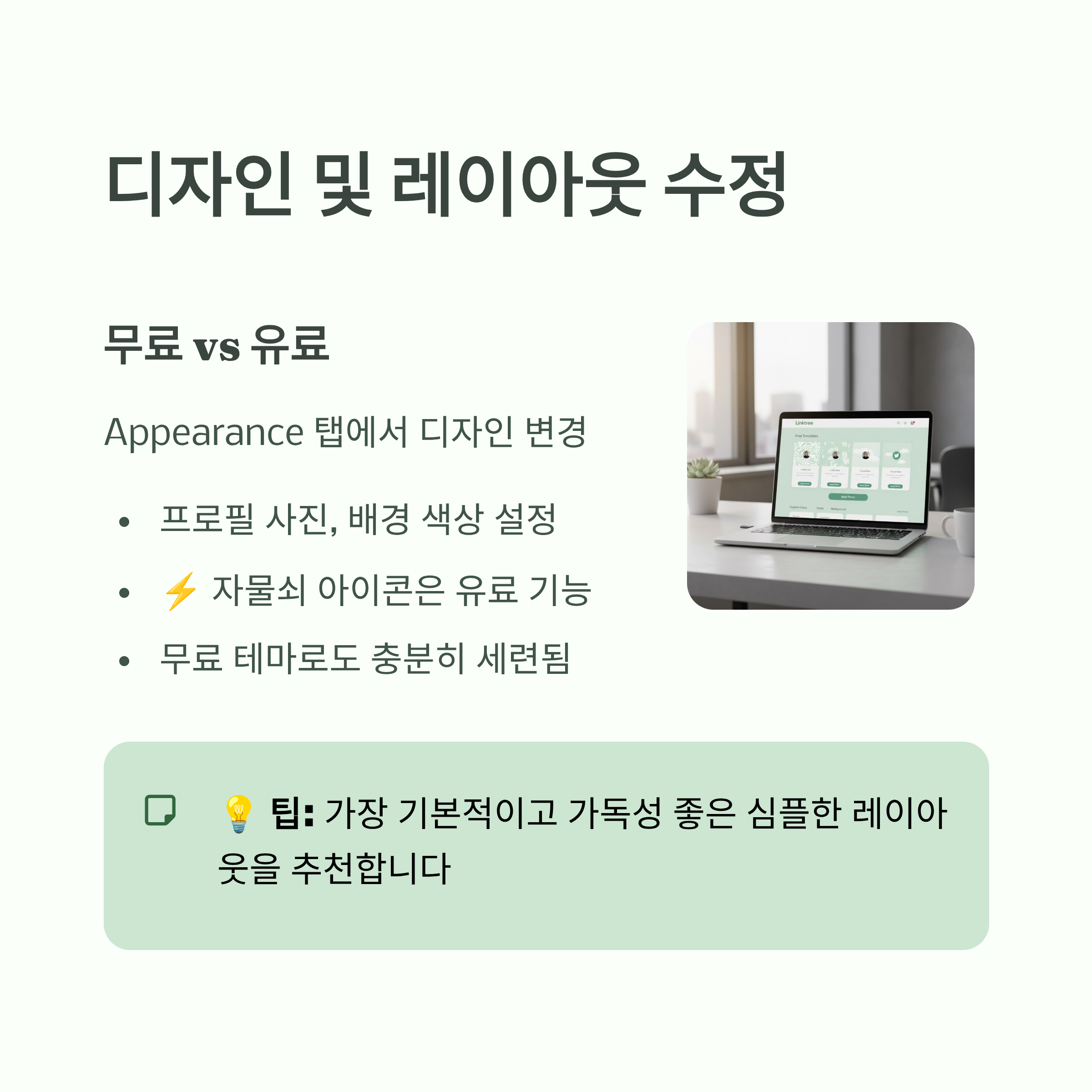 여기서 프로필 사진, 배경 색상, 버튼 모양 등을 변경할 수 있습니다.