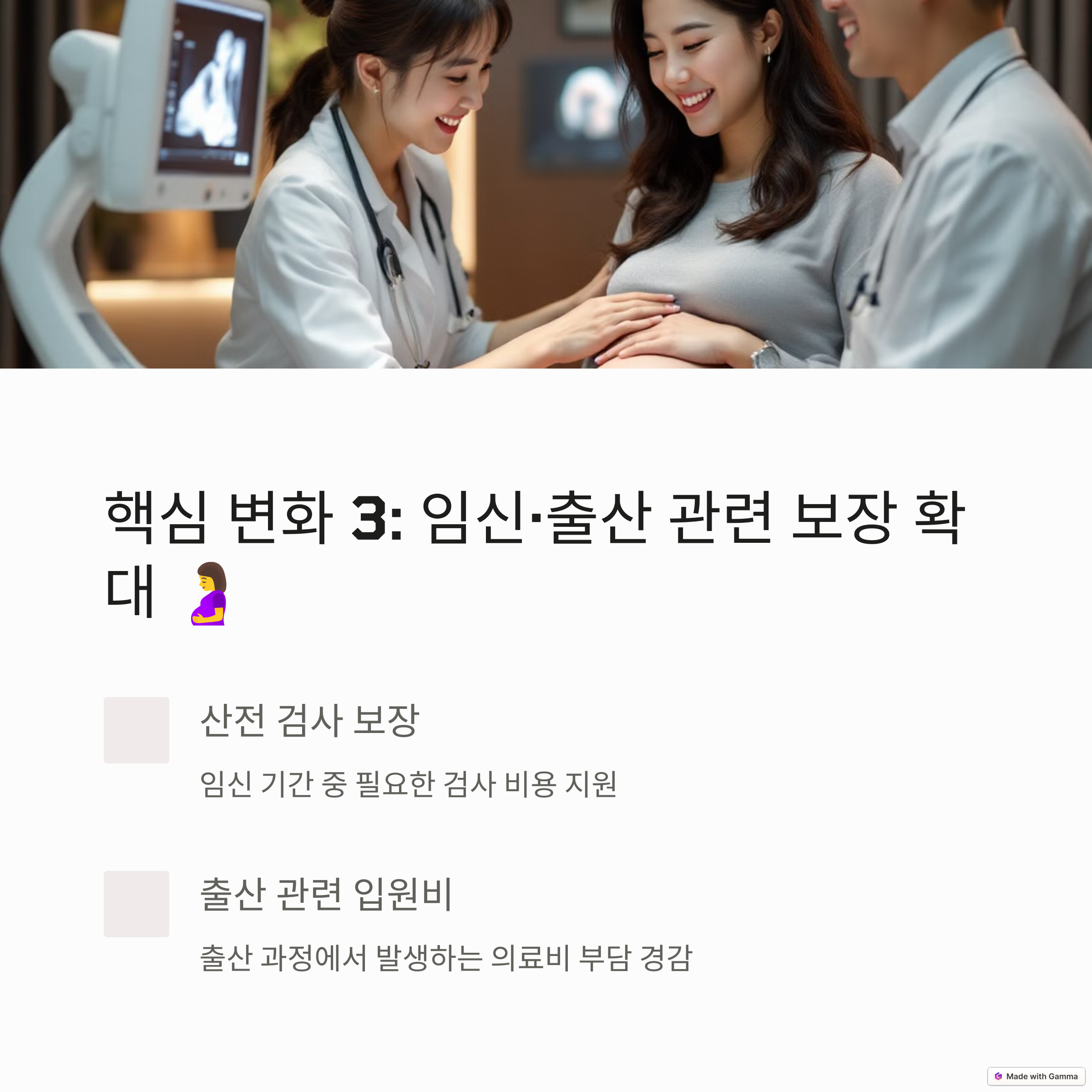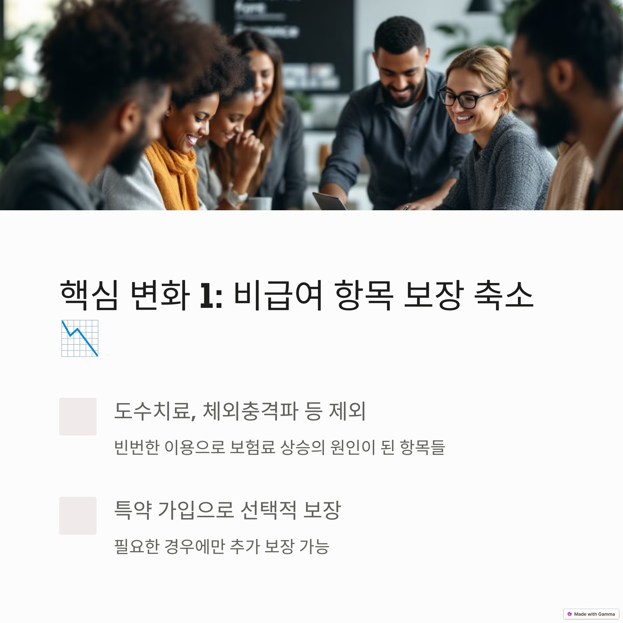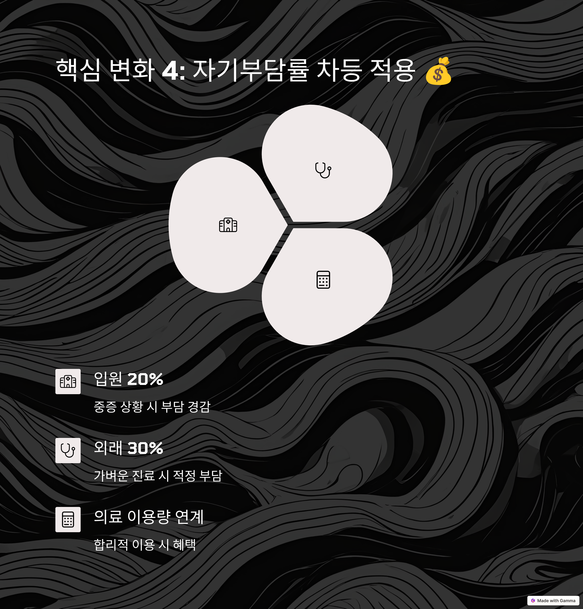| 기존과의 차이점은? | 비급여 항목 조정, 자기부담률 조절, 중증 보장 확대 등이 적용됩니다. |