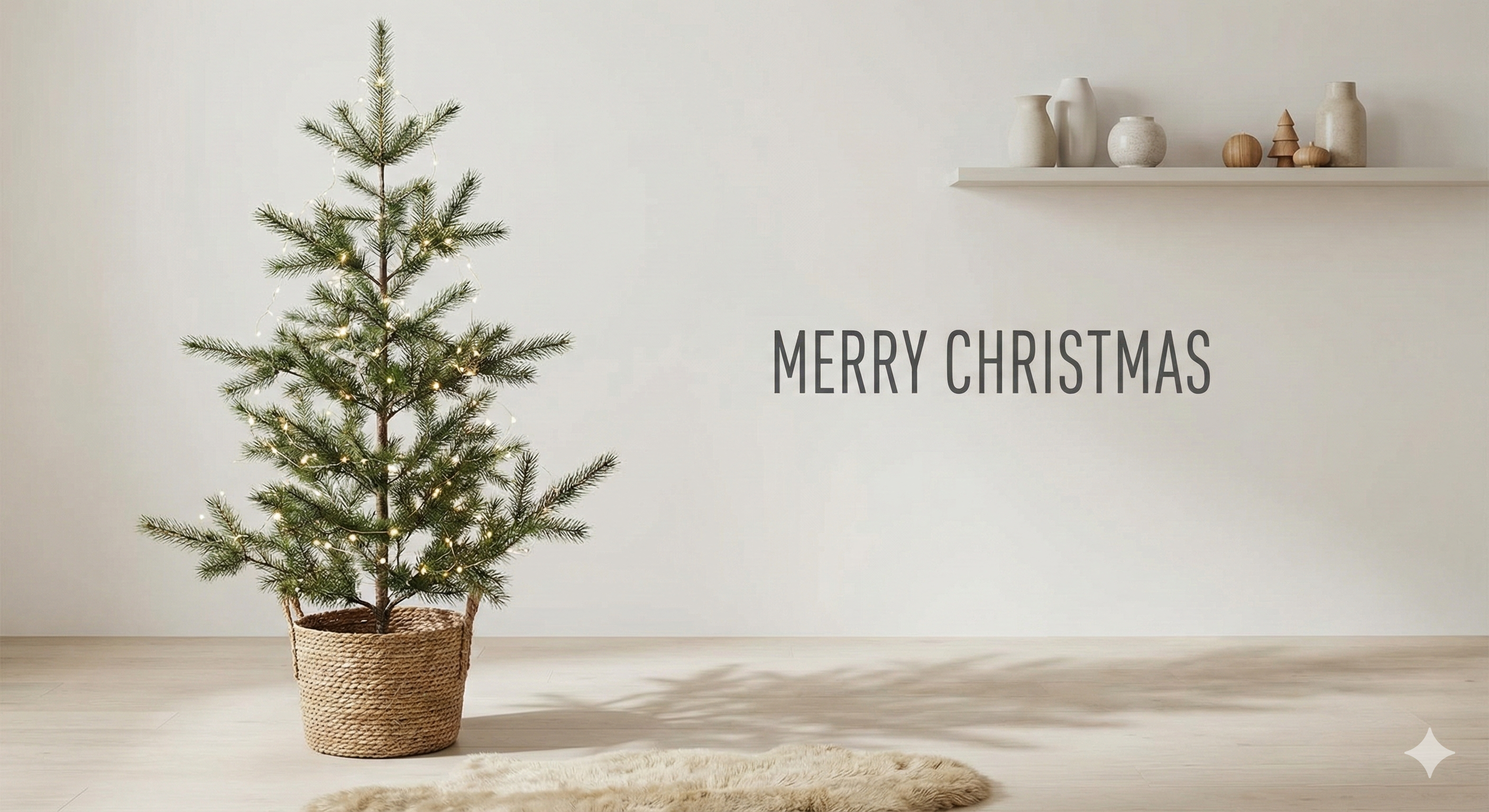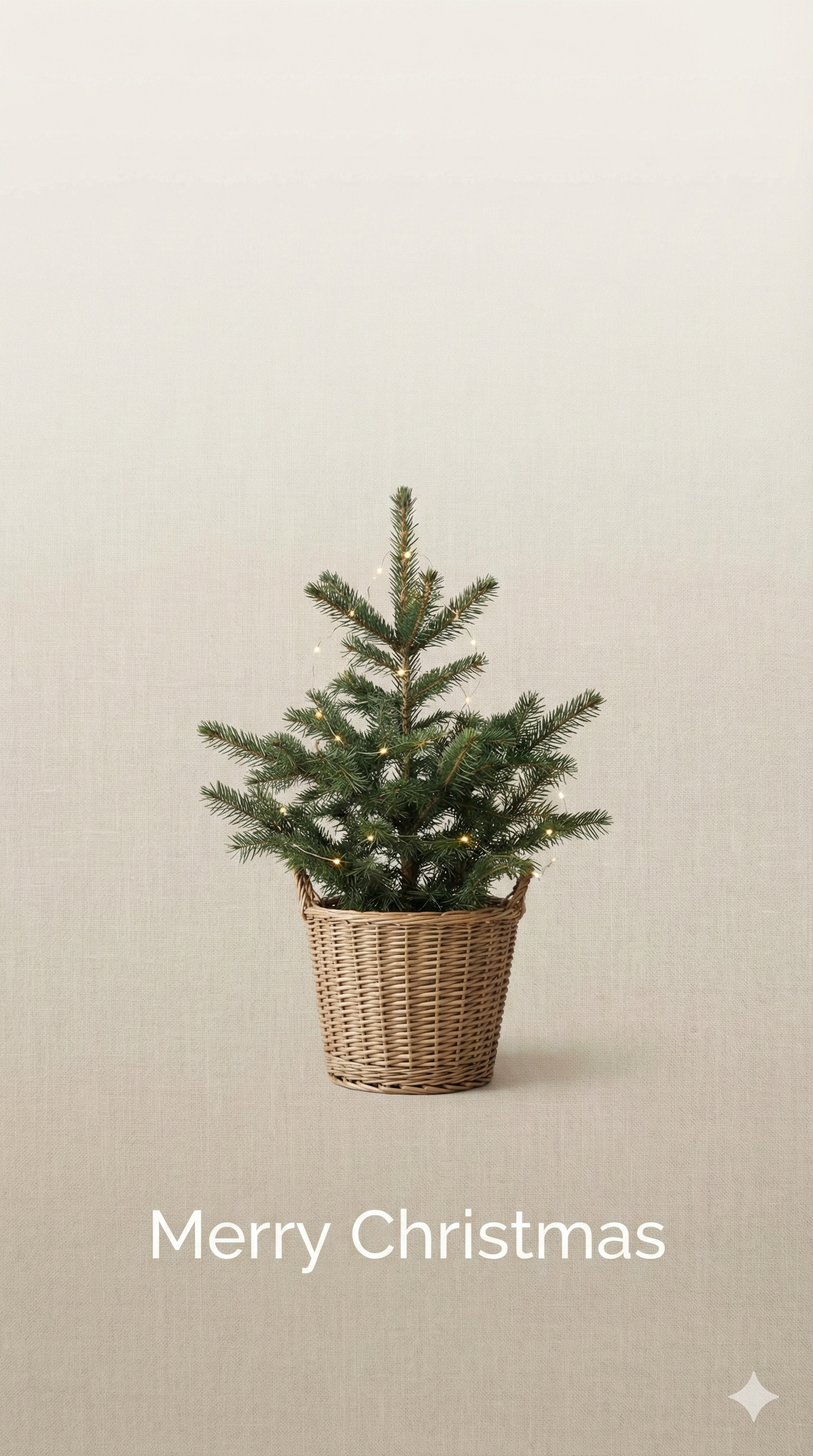 Minimalist Christmas tree with warm fairy lights, beige neutral background, Scandinavian style, “Merry Christmas” simple modern font, clean composition, phone wallpaper vertical