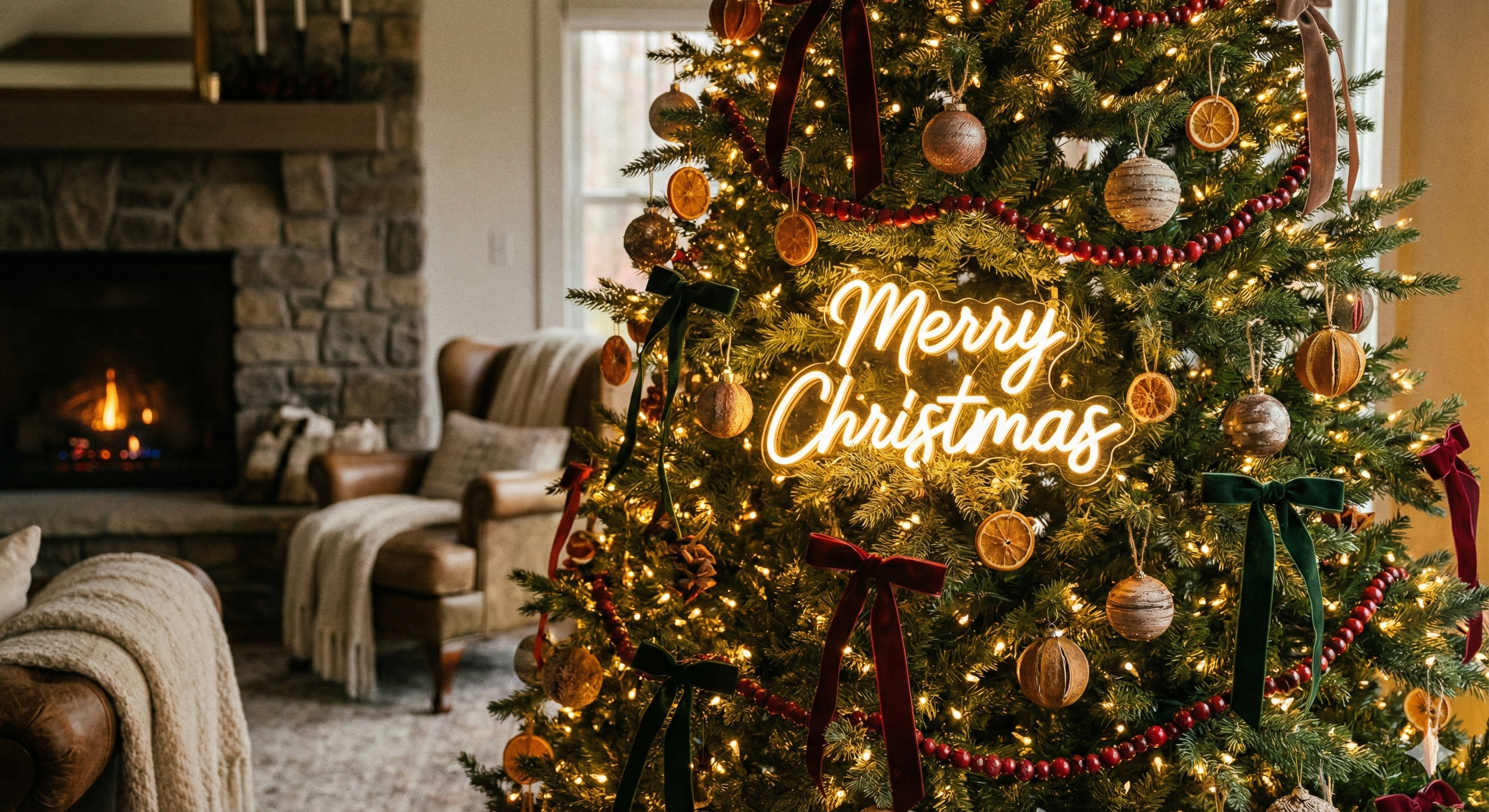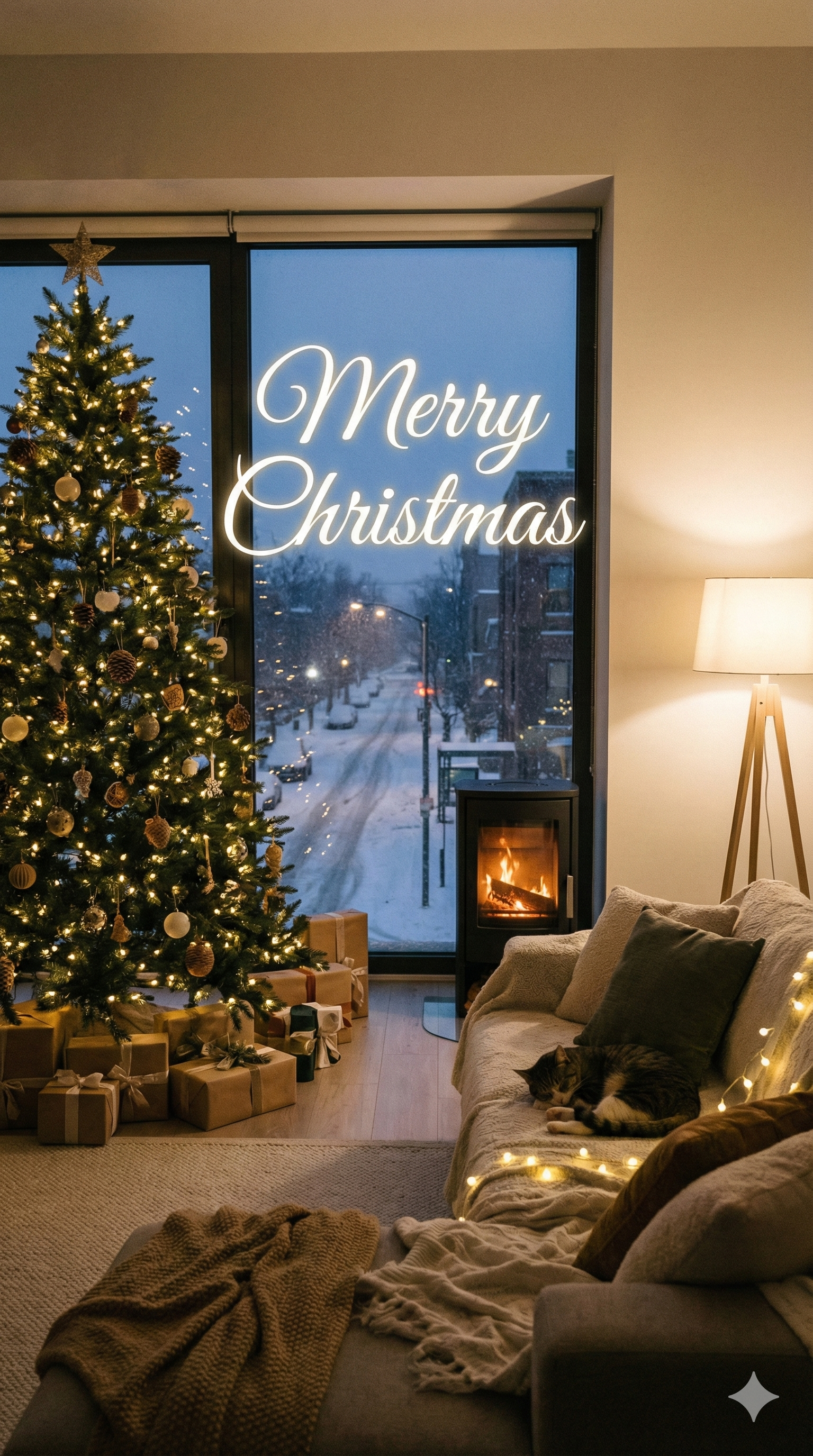 Modern living room with Christmas tree near a window, warm evening lights, cozy lifestyle mood, “Merry Christmas” centered with soft glow, realistic photography look, smartphone wallpaper