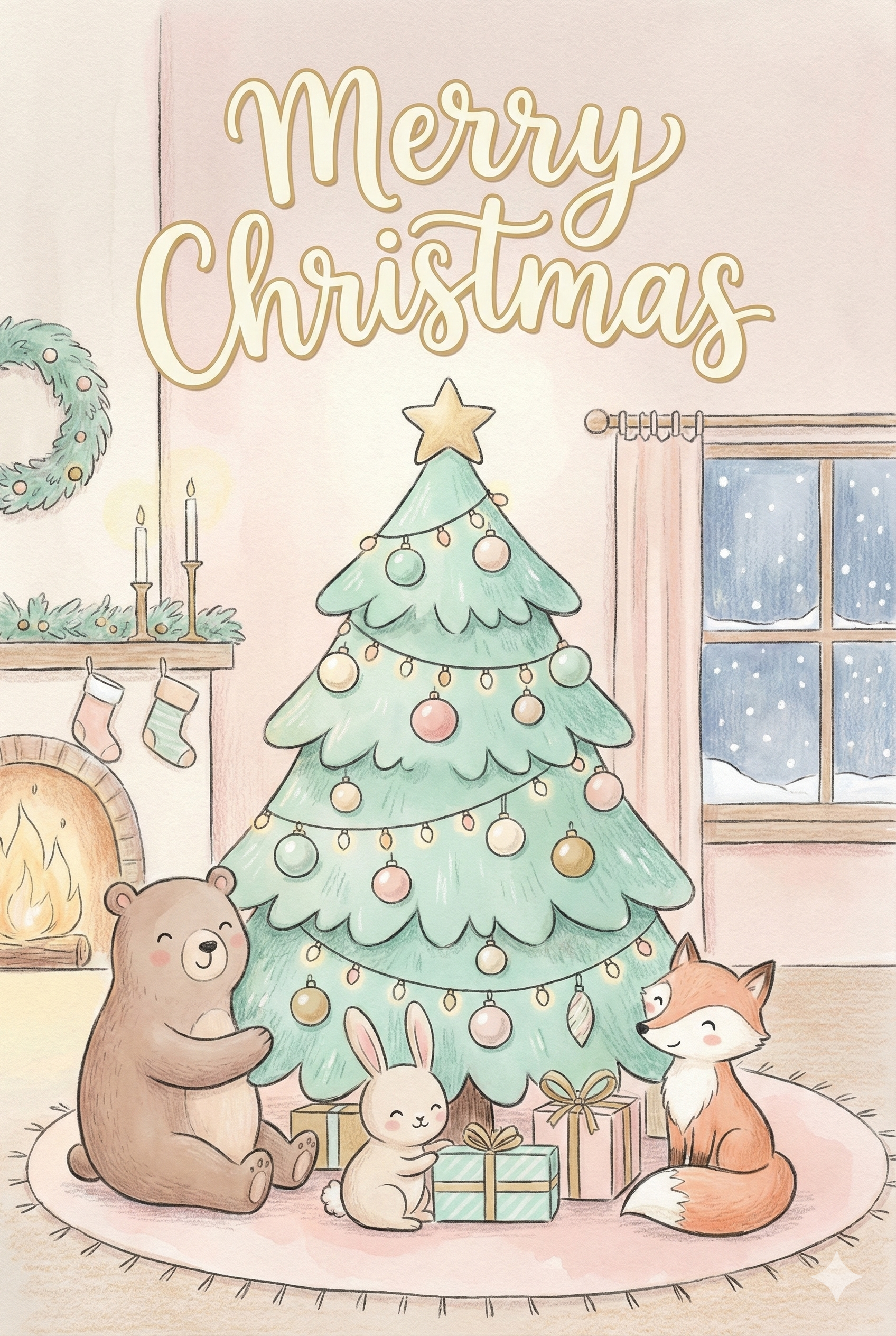 Cute cozy Christmas tree illustration style, soft pastel colors, friendly and warm mood, “Merry Christmas” large and clear, perfect for sharing as a holiday greeting, vertical format